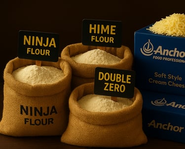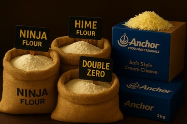 Tersedia tepung pilihan seperti Hime, Ninja, Double Zero, dan Yokozuna, serta bahan kuliner premium seperti whipping cream, cooking cream, mozzarella, dan keju berkualitas.